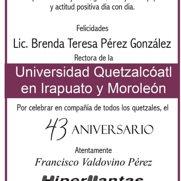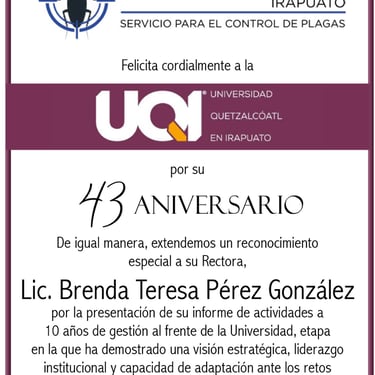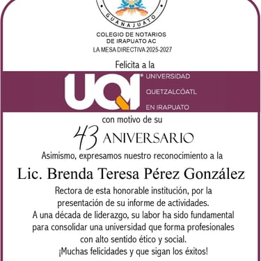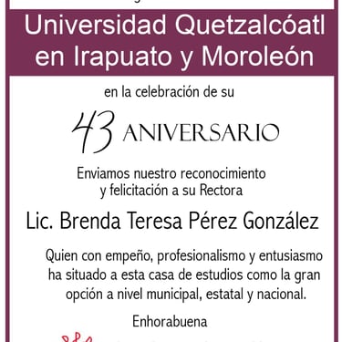 La Universidad Quetzalcóatl en Irapuato (UQI) celebró en el Auditorio Kukulkán sus 43 años de historia y una década de liderazgo bajo la gestión de la Lic. Brenda Teresa Pérez González, Rectora de esta institución.